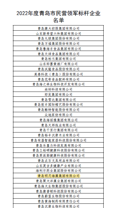 日前,青島市民營經(jīng)濟(中小企業(yè))發(fā)展工作領(lǐng)導(dǎo)小組辦公室公布了2022年度青島市民營領(lǐng)軍標(biāo)桿企業(yè)名單,這是青島首次評選民營領(lǐng)軍標(biāo)桿企業(yè)。青島明月海藻集團光榮上榜,成為“2022年度青島市民營領(lǐng)軍標(biāo)桿企業(yè)”。