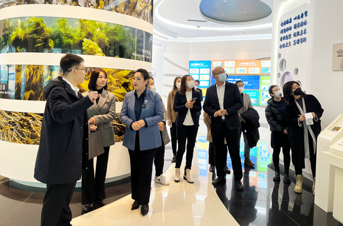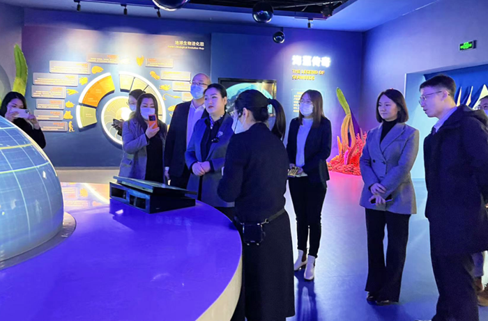 青島金圃廣源科技有限公司領(lǐng)導(dǎo)一行在青島明月海藻生物健康科技集團(tuán)副總裁孫占一的帶領(lǐng)下參觀明月海藻世界及中國(guó)海藻科技館。
