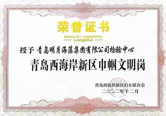 日前,青島明月海藻集團(tuán)檢驗(yàn)中心被區(qū)婦聯(lián)授予“巾幗文明崗”榮譽(yù)稱號。