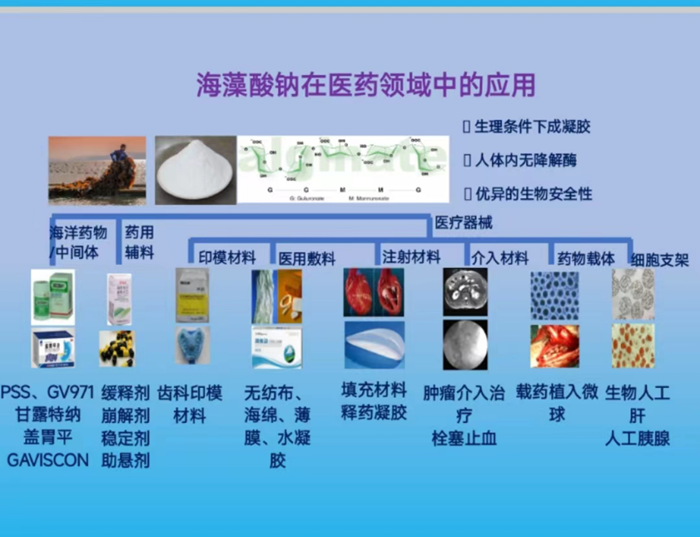 張德蒙博士主要從四個方面展開介紹:海藻酸鈉是從海帶等褐藻中提取的一種天然多糖,已廣泛應(yīng)用于食品、化妝品及醫(yī)藥等領(lǐng)域,可用作海洋藥物原料及中間體,如降血脂藥藻酸雙酯鈉PSS、抗老年癡呆藥971;可用作口服藥物的緩釋劑,如普瑞巴林緩釋片、硝苯地平控釋片。