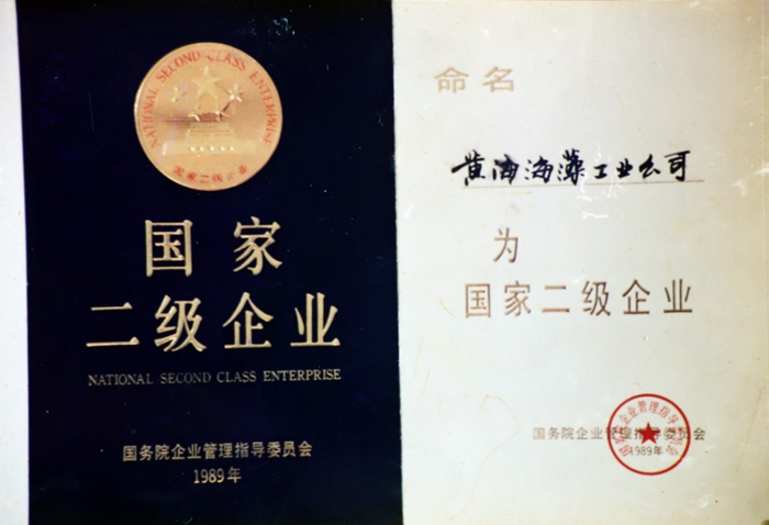 1988年,公司相繼獲得農(nóng)業(yè)部設(shè)備管理優(yōu)秀單位獎(jiǎng)、生產(chǎn)節(jié)能先進(jìn)集體和全面質(zhì)量管理獎(jiǎng)。1989年,黃海海藻工業(yè)公司被評(píng)為國(guó)家二級(jí)企業(yè)。