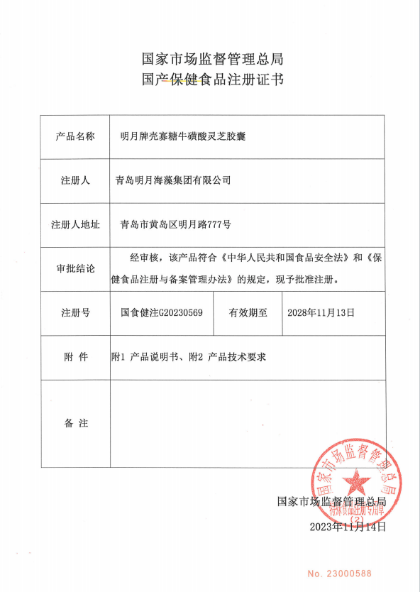 日前,青島明月海藻集團“明月牌?殼寡糖牛黃酸靈芝膠囊”獲批國家市場監(jiān)督管理總局保健食品批件,注冊號國食健注G20230569。