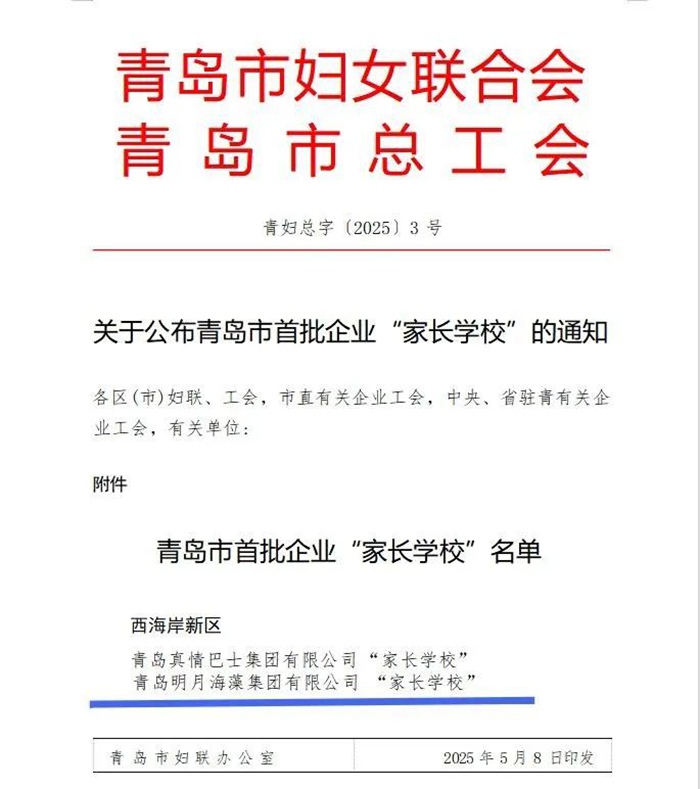 近日,青島市婦聯(lián)、青島市總工會(huì)聯(lián)合公布了青島市首批企業(yè)“家長學(xué)?!泵麊危鄭u明月海藻集團(tuán)成功入選,成為青島市首批20家獲此殊榮的企業(yè)之一。