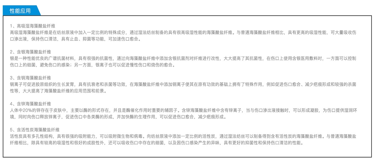 在普通海藻酸鹽纖維生產(chǎn)工藝的基礎(chǔ)上,通過向紡絲原液中添加各種活性成分,包括銀、銅、鋅、活性炭等,以達(dá)到對(duì)海藻酸鹽纖維改性的目的,提高了其各項(xiàng)性能指標(biāo),具有更廣闊的應(yīng)用前景和更優(yōu)異的護(hù)理效果。